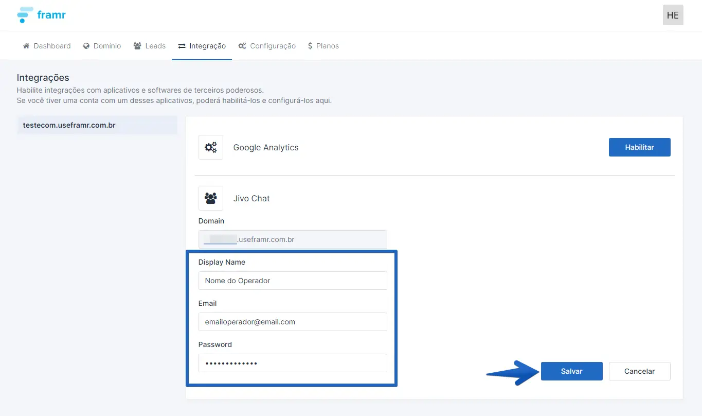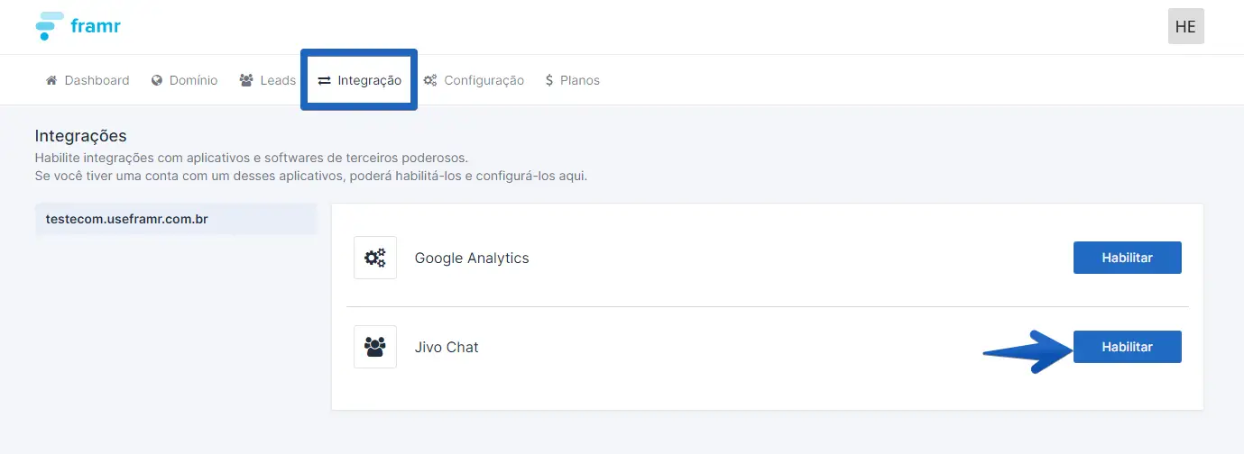 1. Acesse o painel administrativo do Framr e siga até Integração. Clique para Habilitar a integração com o JivoChat.