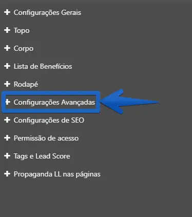 1. Acesse o editor da sua página e clique em Configurações Avançadas Entre no painel administrativo do leadlovers, acesse sua máquina e abra a página na qual deseja incluir o chat. Dentro da página, clique em Configurações (engrenagem).