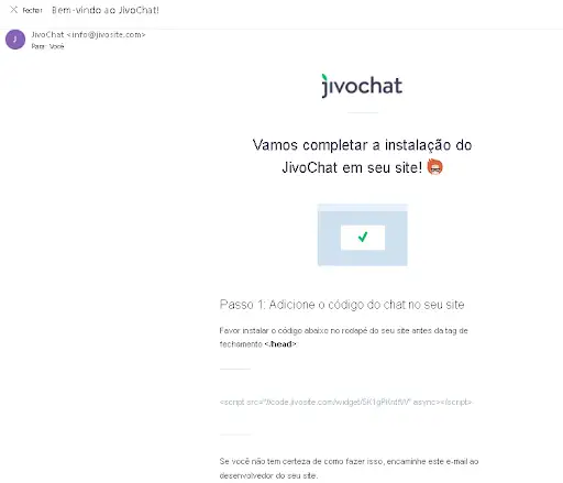 Acesse seu e-mail cadastrado no JivoChat e localize a mensagem enviada com o código html exclusivo de instalação para integrar com sua loja. Caso não localizar, faça o login no painel do JivoChat para encontrar seu código HTML para instalar o chat na sua loja. .Exemplo do e-mail abaixo: