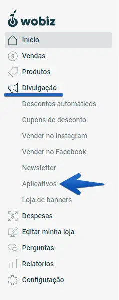 2. Agora, com a tag já criada em seu GTM, acesse o painel administrativo do Wobiz e siga até Divulgação -> Aplicativos.