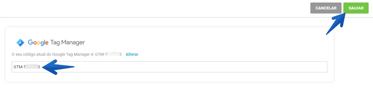 3. Em seu painel do Google Tag Manager, na tela inicial do painel, copie o código de identificação (exemplo de formato: GTM-XXXXXX) localizado na região apontada na imagem abaixo.