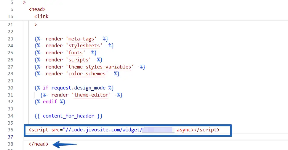 - Dentro do código, cole o código do widget da Jivo logo acima da tag de fechamento