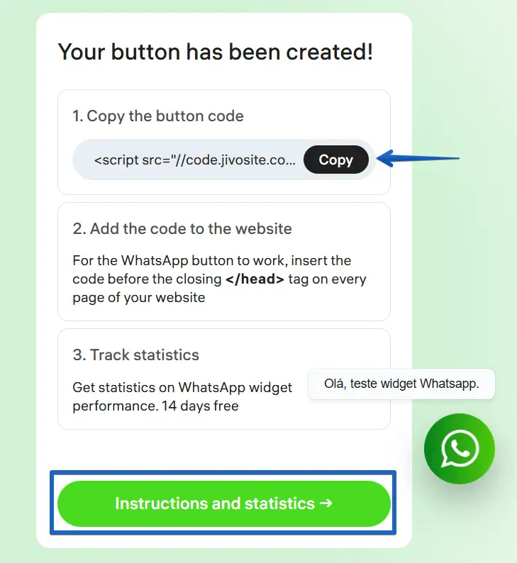- O botão do WhatsApp da Jivo deverá aparecer na posição escolhida durante a criação.