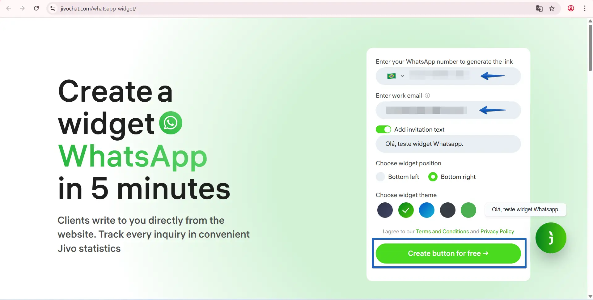 👉 https://www.jivochat.com/whatsapp-widget/ - Insira o seu número de WhatsApp (no formato internacional, ex: +55 11 99999-9999) e o seu e-mail.