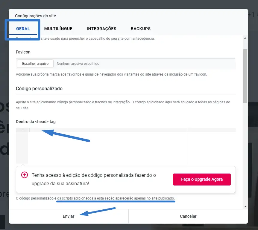 Obs.: o script do chat só aparecerá em seu site após o site ser publicado.