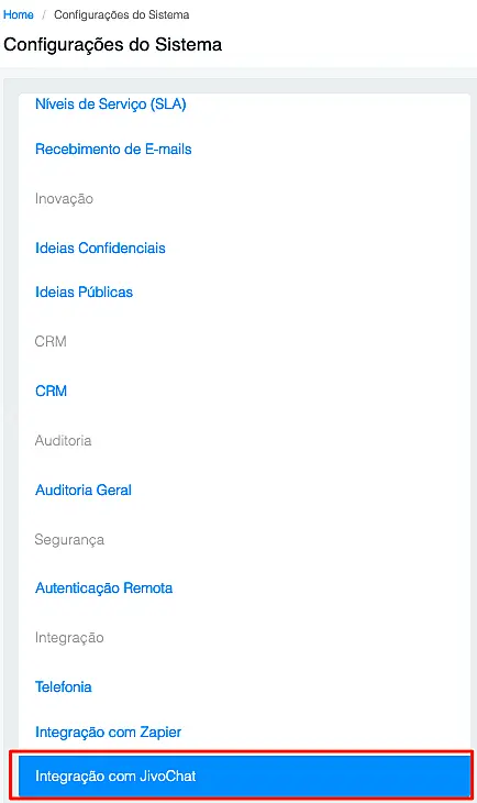 Com o serviço habilitado, vá até o menu Configurações -> Configurações Gerais do Sistema -> Integração com o JivoChat.