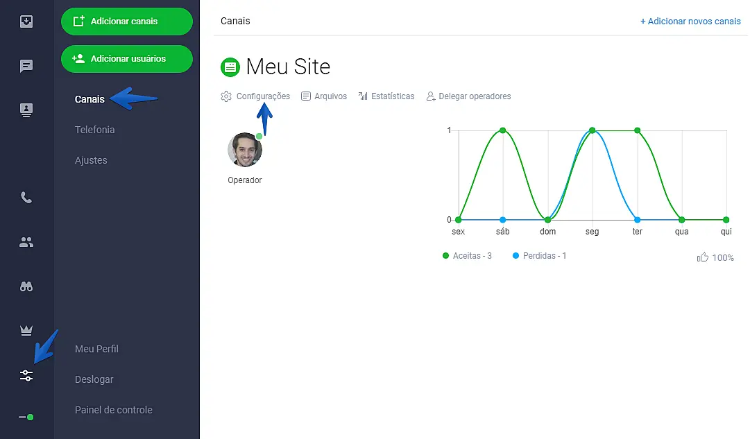 Com a URL em mãos, acesse o aplicativo web do JivoChat, ou qualquer um de nossos apps Desktop, e clique em Configurações -> Canais -> Configurações.