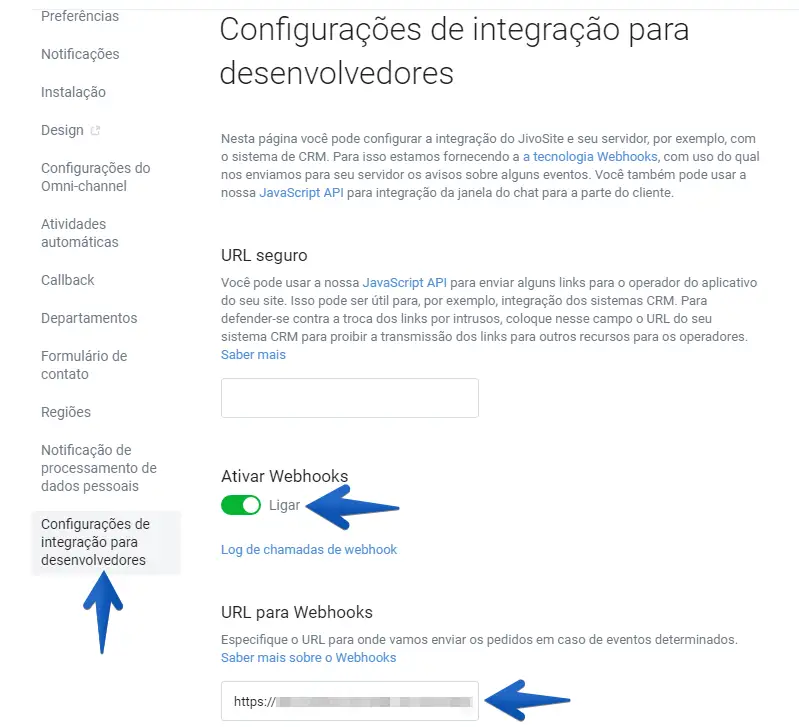 Siga para o menu "Configurações de integração para desenvolvedores", ative os Webhooks e cole sua URL para integração no campo "URL para Webhooks".