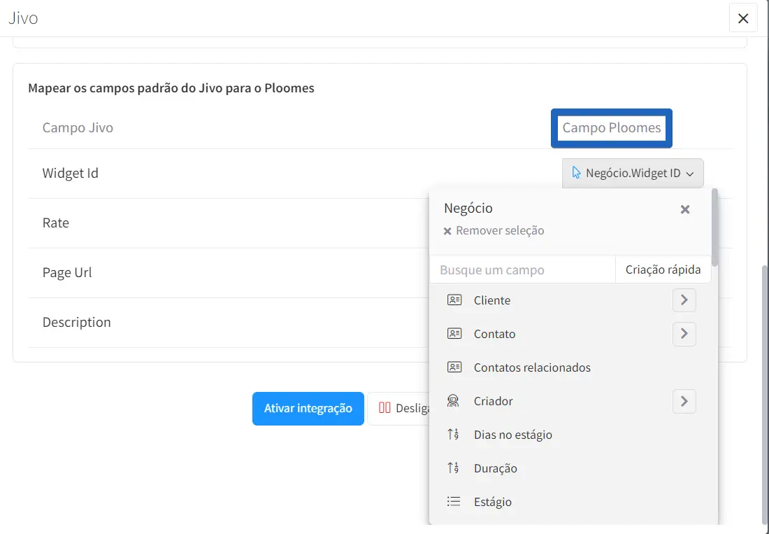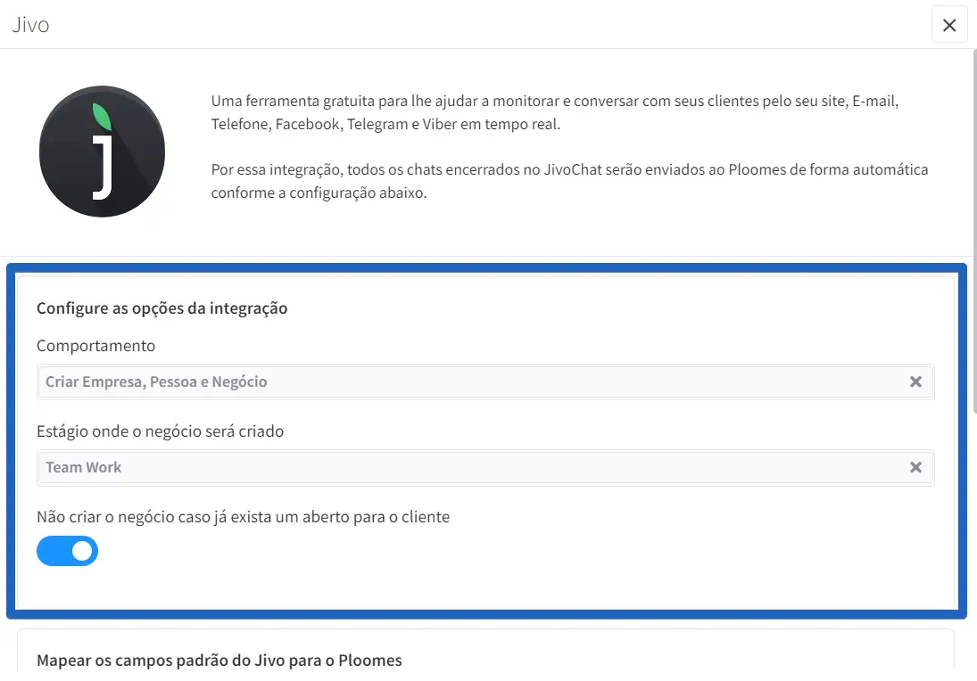 **3.**Você também pode mapear os campos padrões do JivoChat com os campos do Ploomes, como mostrado no exemplo abaixo:
