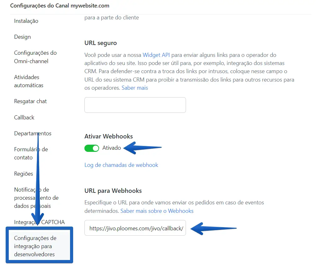 6.No menu à esquerda, clique em "Configurações de integração para os desenvolvedores", ligue a opção "Ativar Webhooks" e cole a URL gerada no campo "URL para Webhooks".