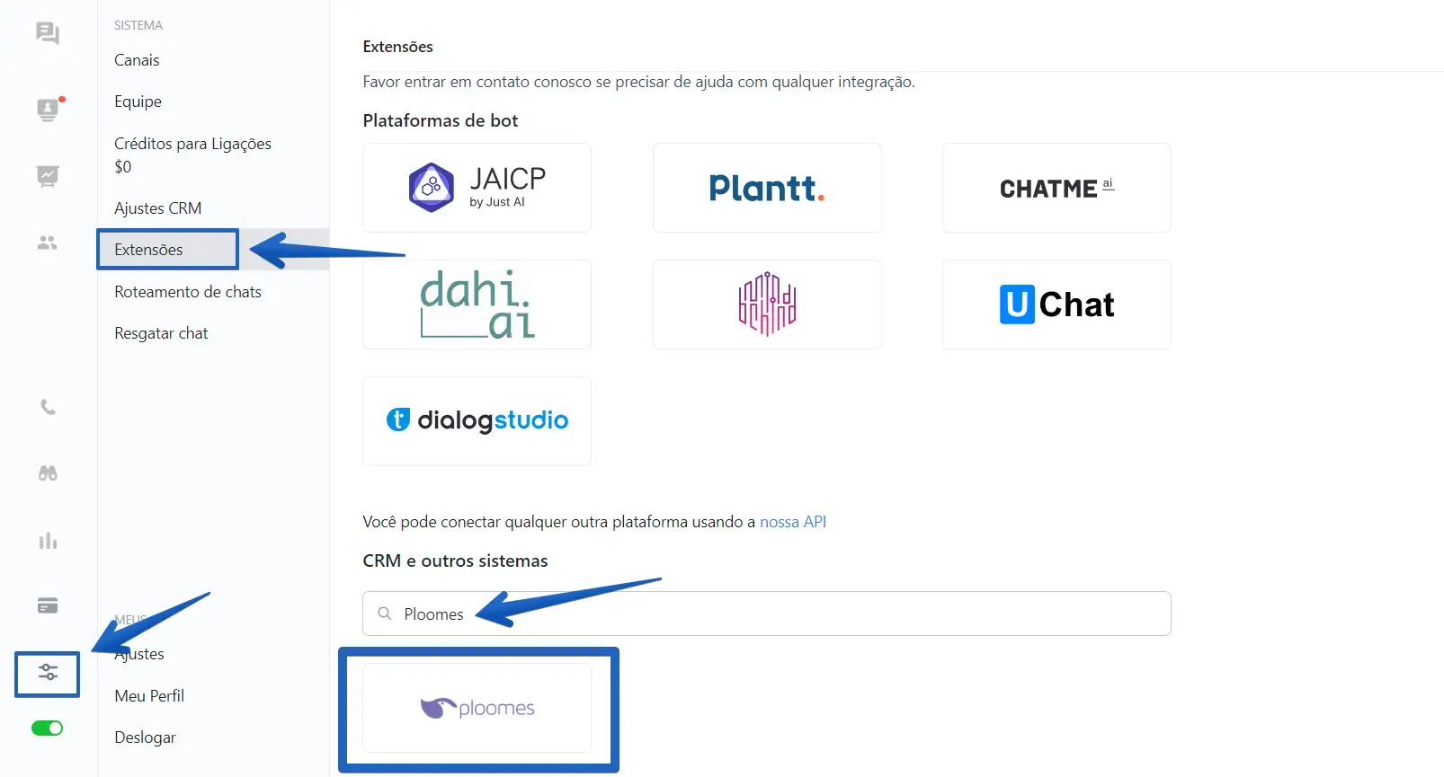 Em Integrações role a tela e em "CRM e outros sistemas", pesquise por Ploomes, como na imagem: