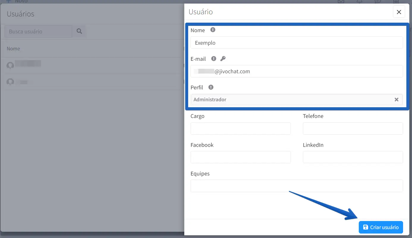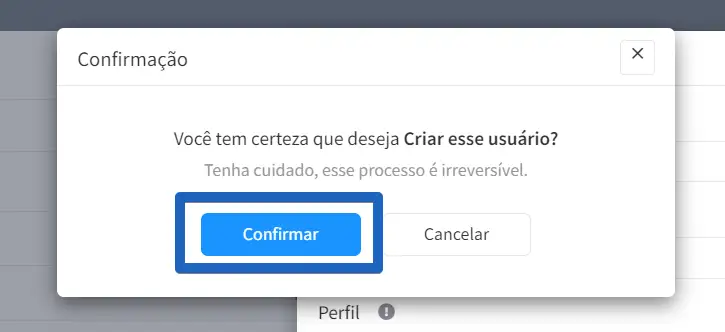Insira um nome, e-mail e escolha o perfil do usuário (recomendamos selecionar a opção "Administrador"). Os outros campos são opcionais. Depois, clique em "Criar usuário" e confirme a criação do usuário.