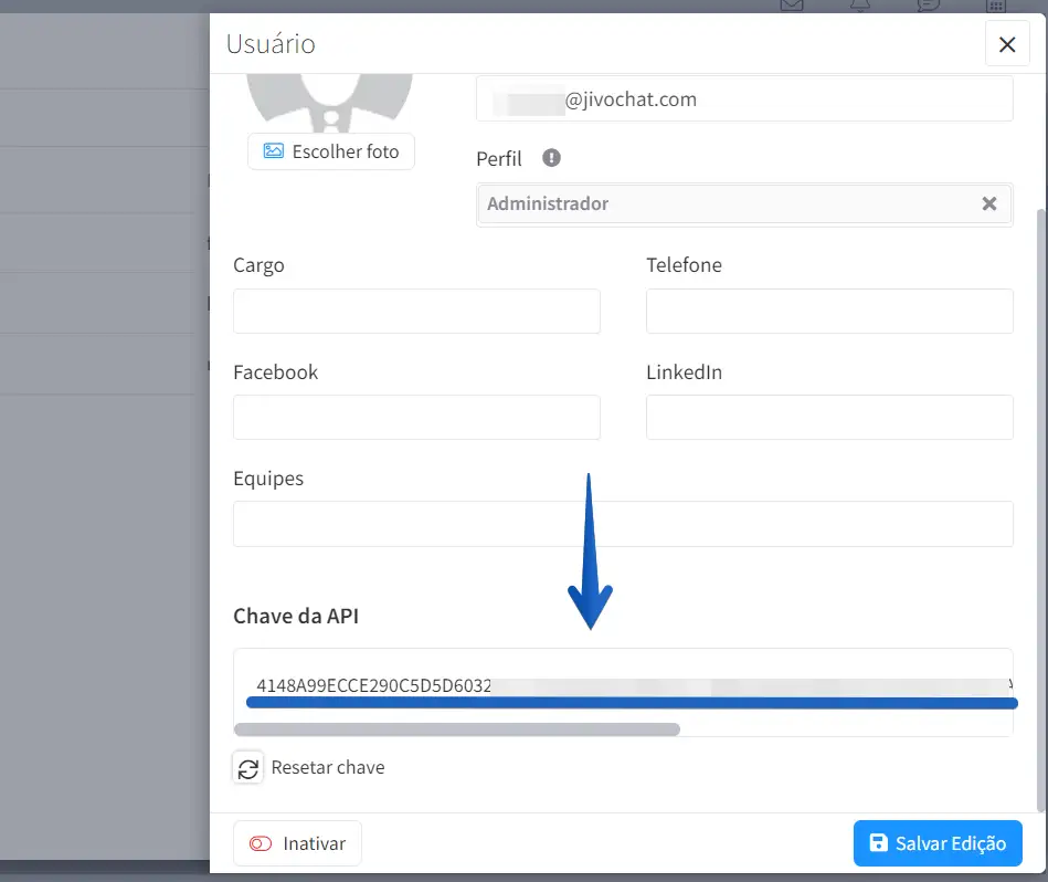 Copie a chave da API do usuário criado e cole no campo "Token de acesso" no aplicativo do JivoChat.