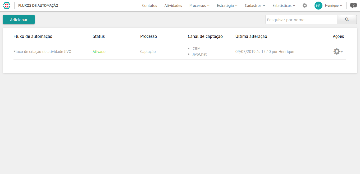 Para criar uma atividade de retorno de contato realizado pelo chat, recomendamos a criação de um fluxo de automação para o canal integrado JivoChat.