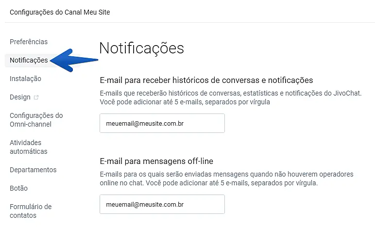 3.Depois, acesse o menu Notificações no painel à esquerda e preencha seu e-mail do Zendesk nos campos E-mail para receber os históricos das conversas e notificações e E-mail para mensagens off-line.