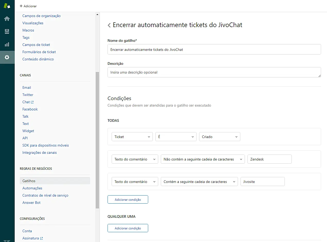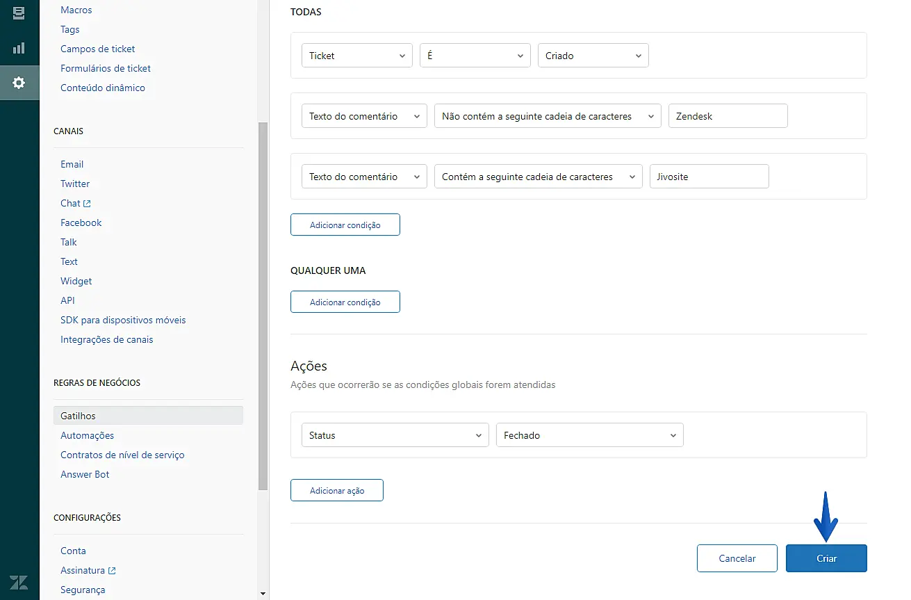 5.Agora você precisará criar um Gatilho no Zendesk. Acesse sua conta do Zendesk e clique no botão Admin. Na seção Regras de Negócios, selecione Gatilhos para criar um novo Gatilho com as seguintes condições: