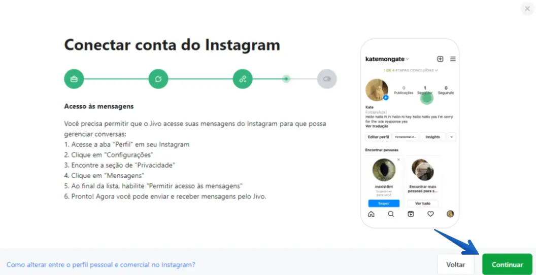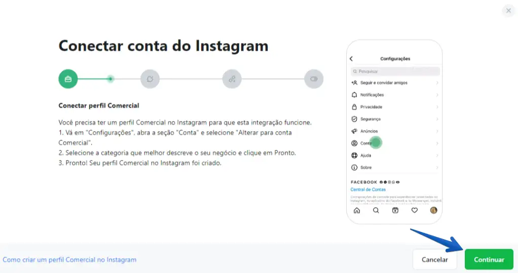 Passo 6: Agora, você irá conectar o perfil comercial do seu Instagram. Preste muita atenção aos requisitos, como ter uma conta comercial, caso ainda não tenha, siga as instruções na tela ou acesse esse tutorial para configurar uma conta empresarial no Instagram. Clique em "Continuar" para prosseguir.