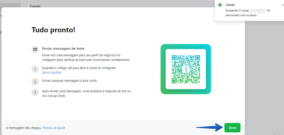 Passo 11: Tudo pronto! O seu Instagram agora está integrado com o JivoChat. Após adicionar o canal, envie uma mensagem de teste, seguindo as instruções exibidas na tela, e clique em "Done"