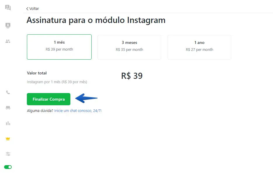 Passo 2: Na próxima tela, escolha a licença que deseja assinar (mensal, trimestral ou anual) e, em seguida, clique em "Finalizar Compra".