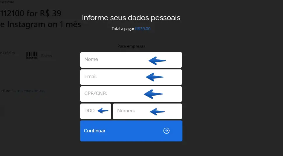 Passo 4: O sistema solicitará que você preencha suas informações pessoais para faturamento. Após preencher as informações, clique em "Continuar".