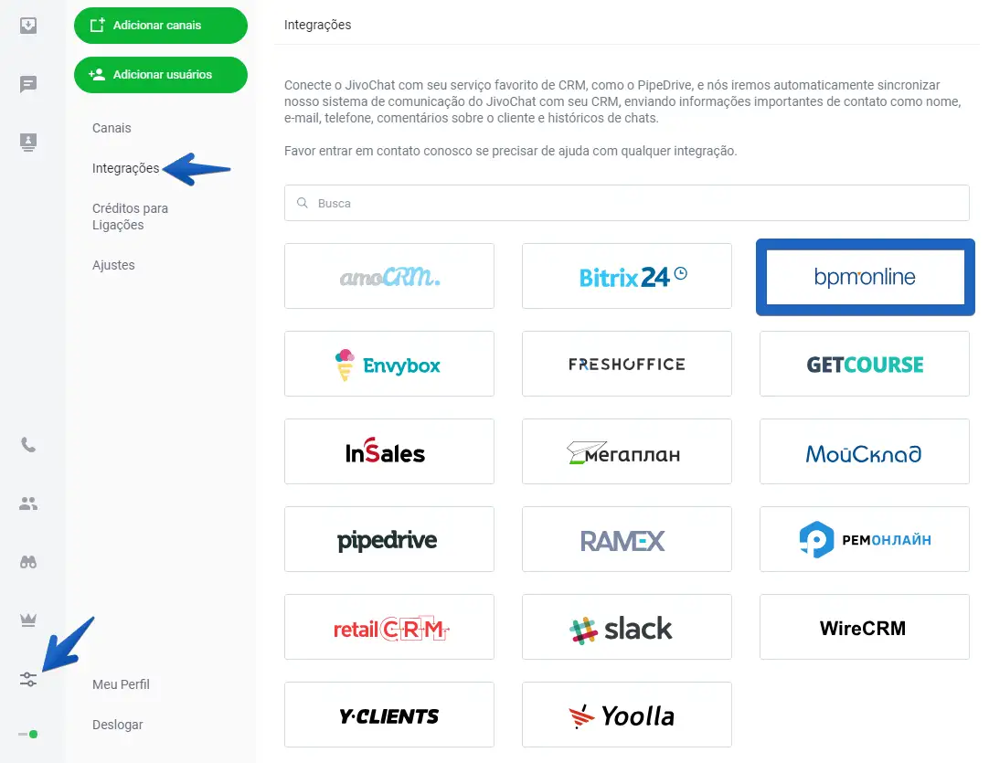 Para integrar o Creatio ao JivoChat, abra o aplicativo web do JivoChat ou o aplicativo para Desktop, acesse as Configurações -> Integrações -> e clique em Creatio.
