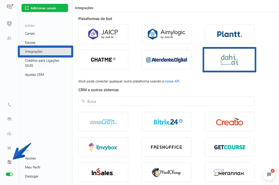 Com o token em mãos, acesse seu app web do JivoChat ou um de nossos apps para Desktop e vá até Configurações -> Integrações -> Selecione o Dahi.ai.