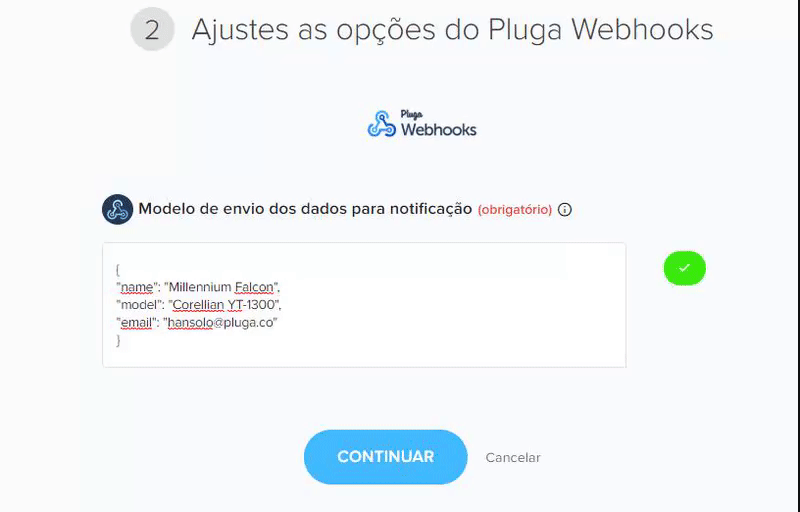 Em "Modelo de envio dos dados para notificação", cole o JSON referente ao gatilho que você quer enviar para a sua ferramenta de destino e clique em "Continuar". Veja o exemplo: