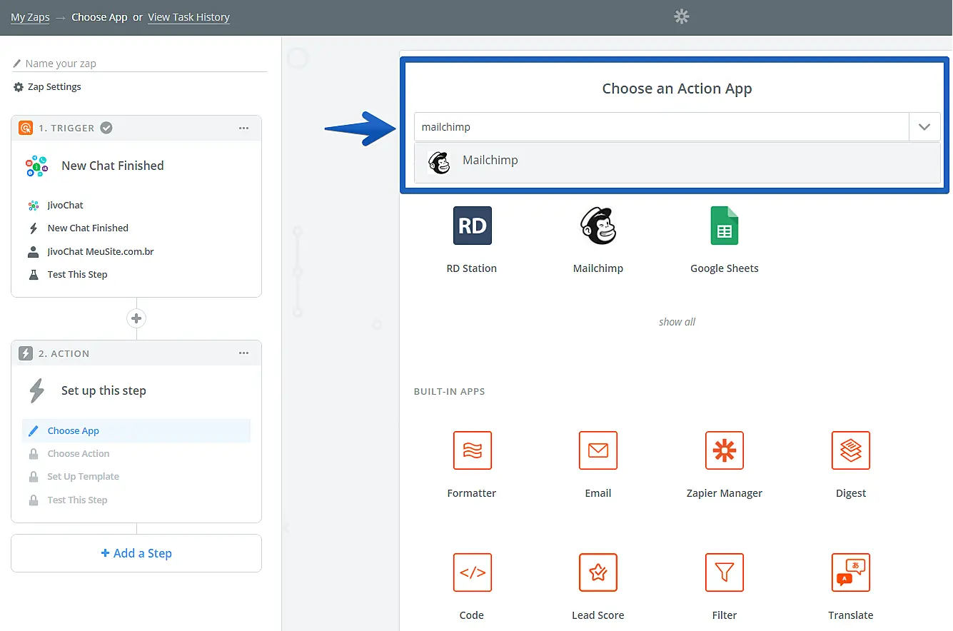 Pesquise pelo aplicativo MailChimp e selecione-o na lista.