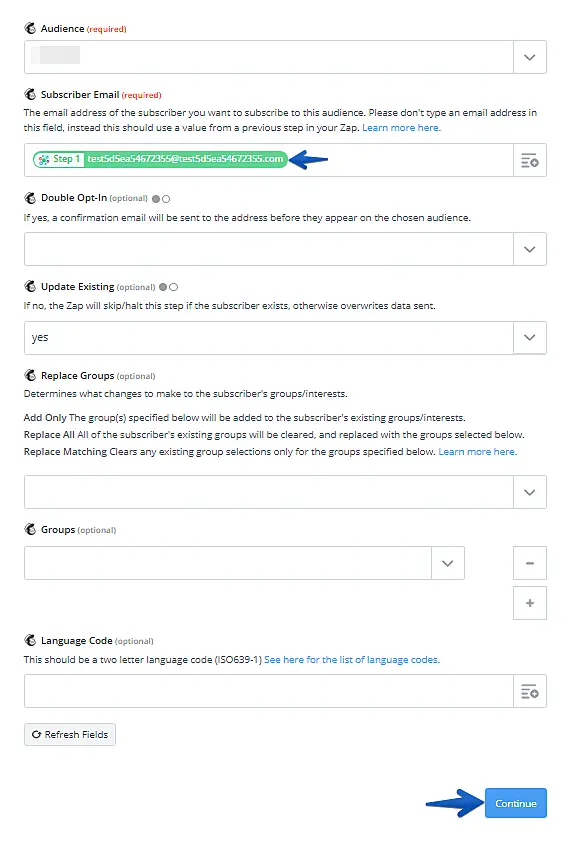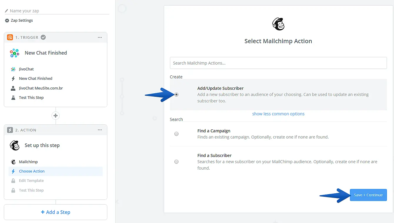 Escolha a ação desejada e clique em "Save + Continue". No exemplo deste tutorial escolhemos a opção mais comum chamada "Add/Update Subscriber".