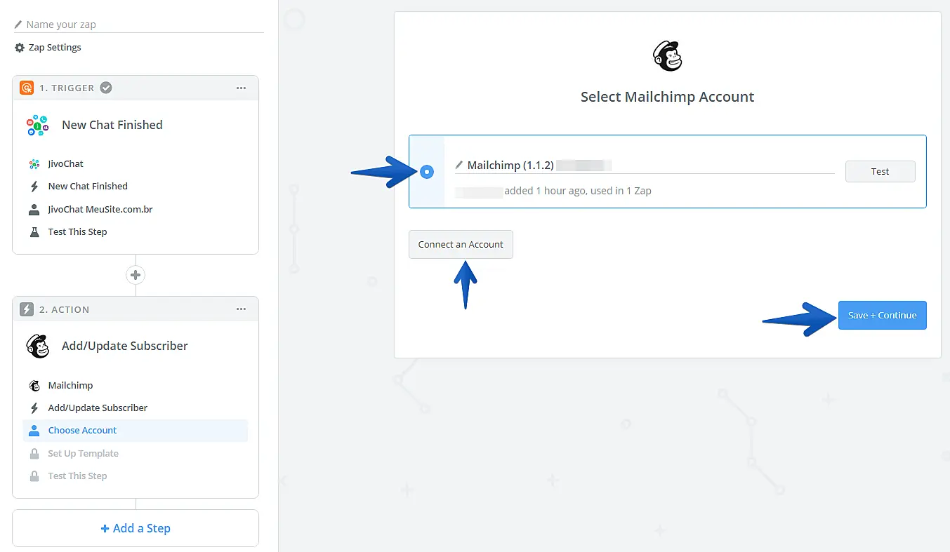 Conecte sua conta do MailChimp, selecione-a na lista e clique em "Save + Continue".