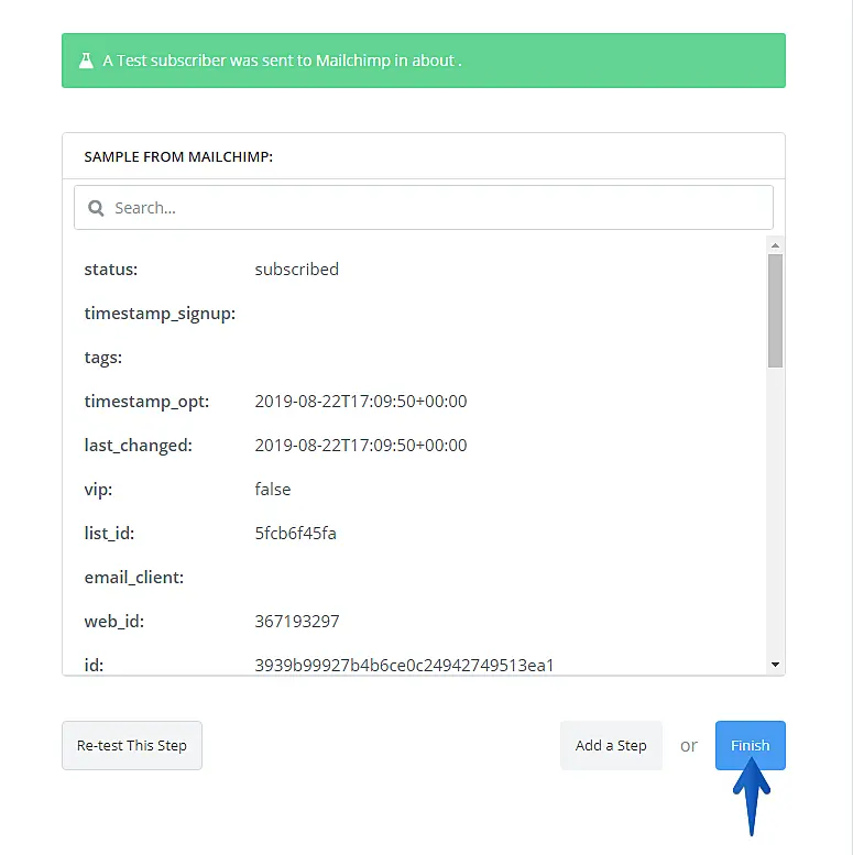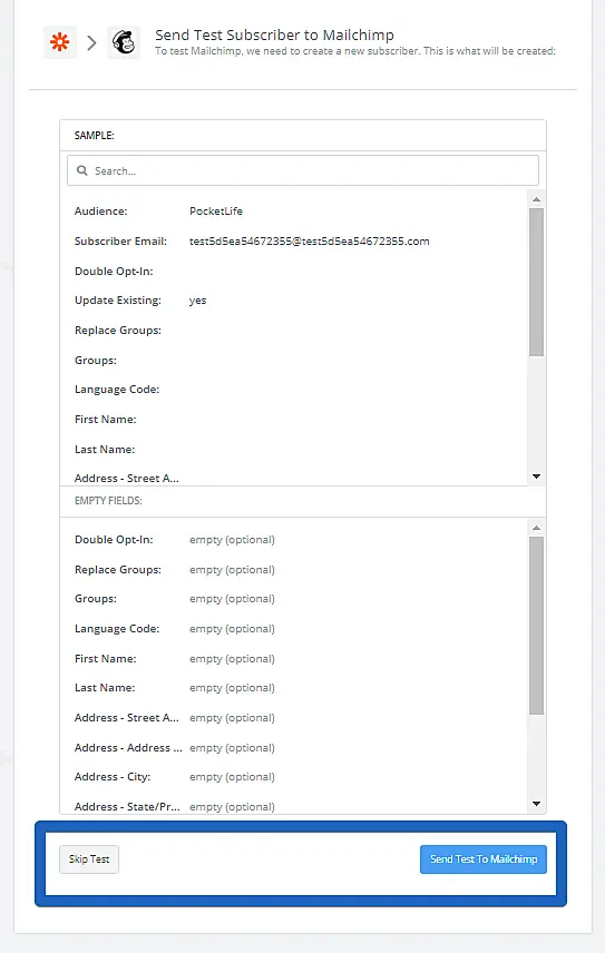 No próximo passo, você poderá enviar um teste para o MailChimp ou pular o teste.
