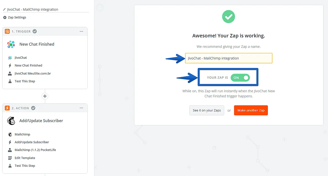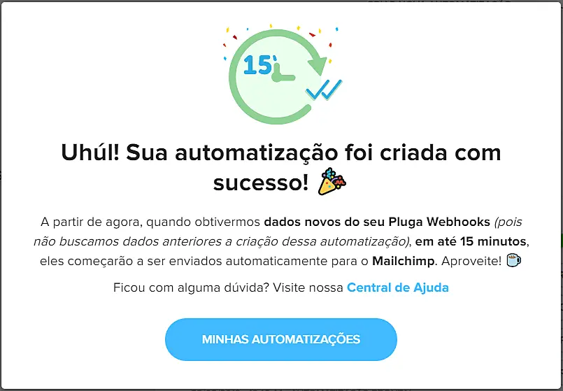 Pronto! Agora é só deixar os robôs do Pluga trabalharem para você. Todos os contatos gerados pelo JivoChat serão enviados a sua conta do MailChimp no formato que você configurou. 😎