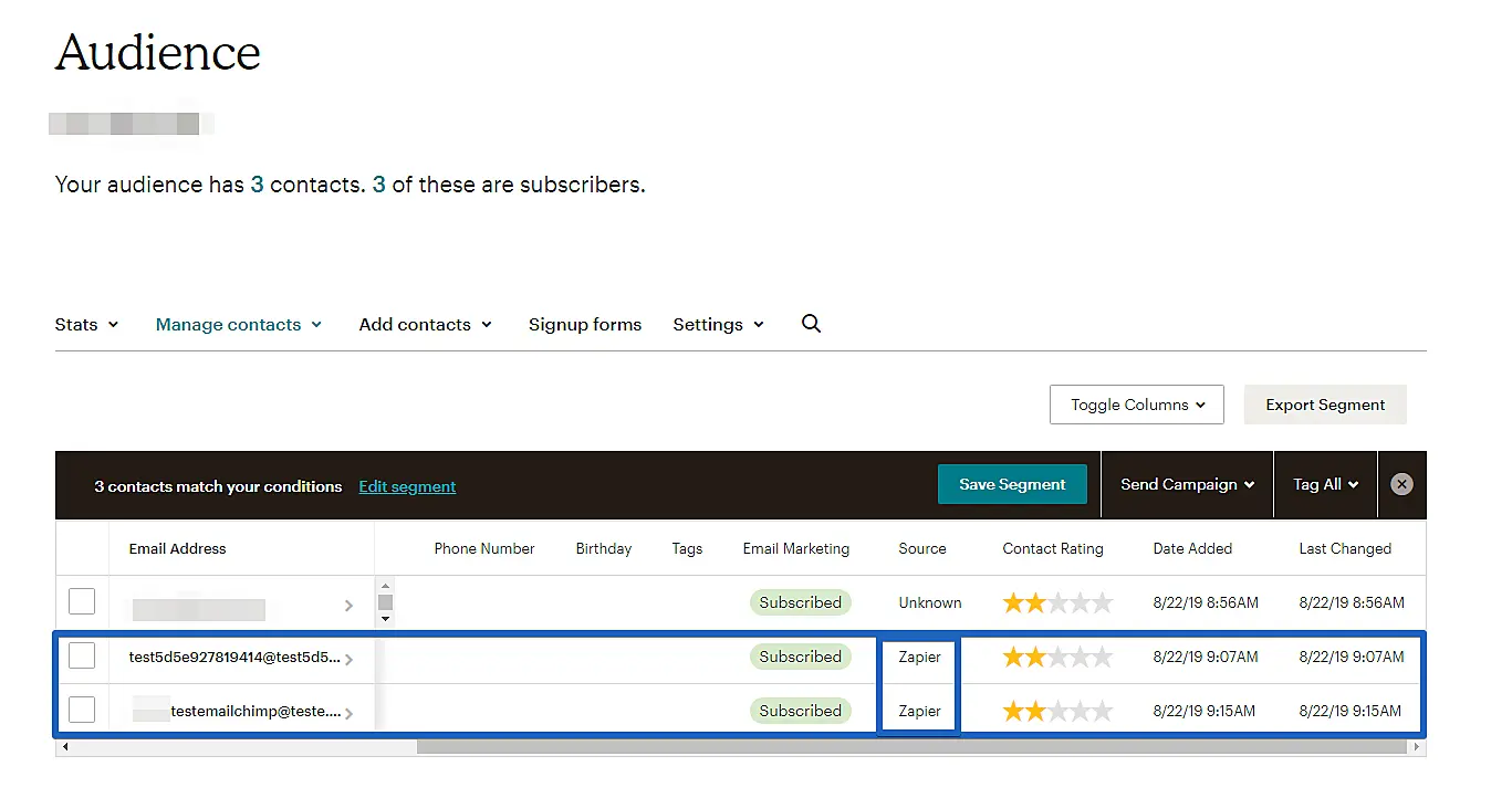 Pronto! Agora você receberá os dados selecionados do nosso evento "chat_finished" diretamente nos dados de Público (Audience) da sua conta do MailChimp. Os contatos gerados pelo chat do JivoChat, que contenham e-mail de contato do visitante/cliente, irão gerar ou atualizar um contato no seu Público (Audience) escolhido do MailChimp.
