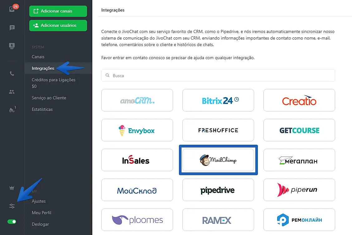 Uma das integrações disponíveis é com a plataforma MailChimp. Para integrar o JivoChat ao MailChimp, basta seguir o tutorial abaixo: