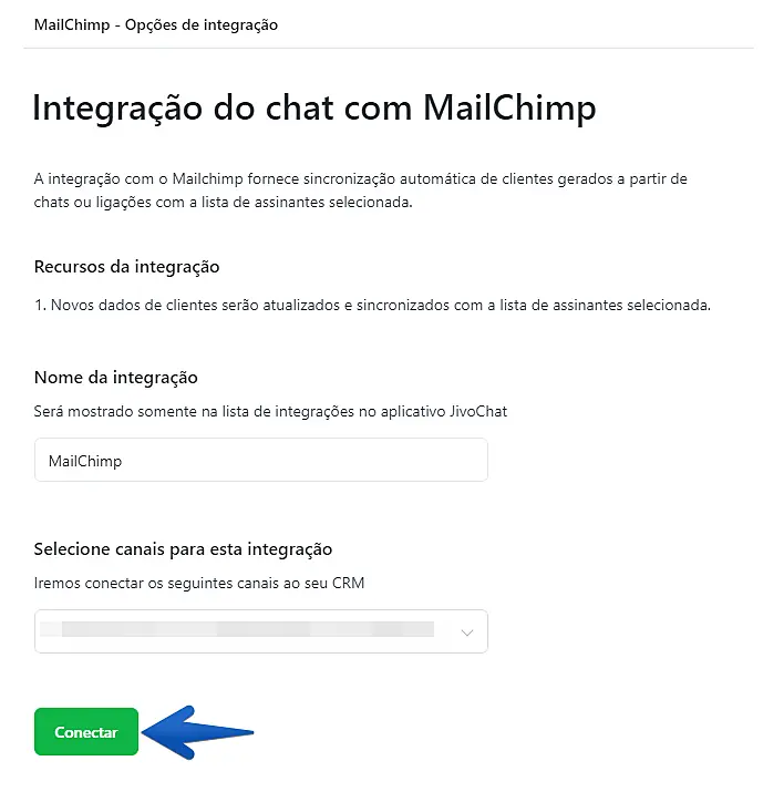 Pronto! A integração foi conectada com sucesso. Sempre que um chat que contenha dados de contato de um cliente for finalizado, o lead será enviado automaticamente para a lista selecionada da sua conta do MailChimp.