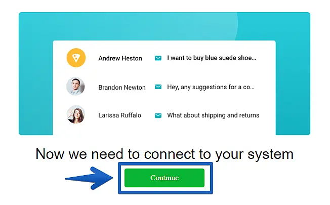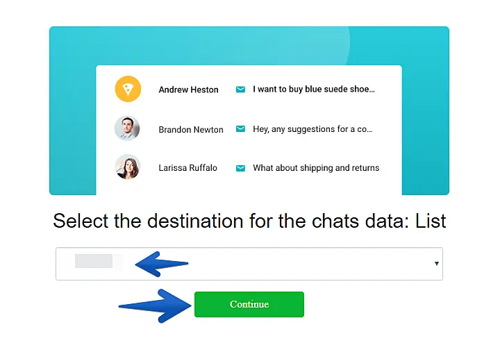 Selecione uma lista existente do seu MailChimp para receber os contatos gerados no JivoChat e clique em "Continue" (Continuar).