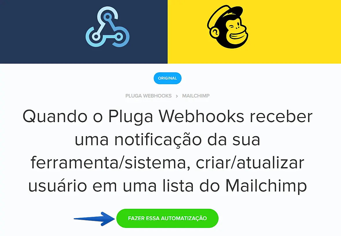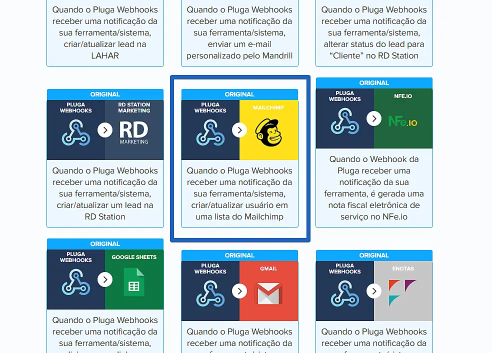 Acesse a página de automatizações do Pluga Webhooks e selecione a opção de integração com o MailChimp na lista de integrações disponíveis.