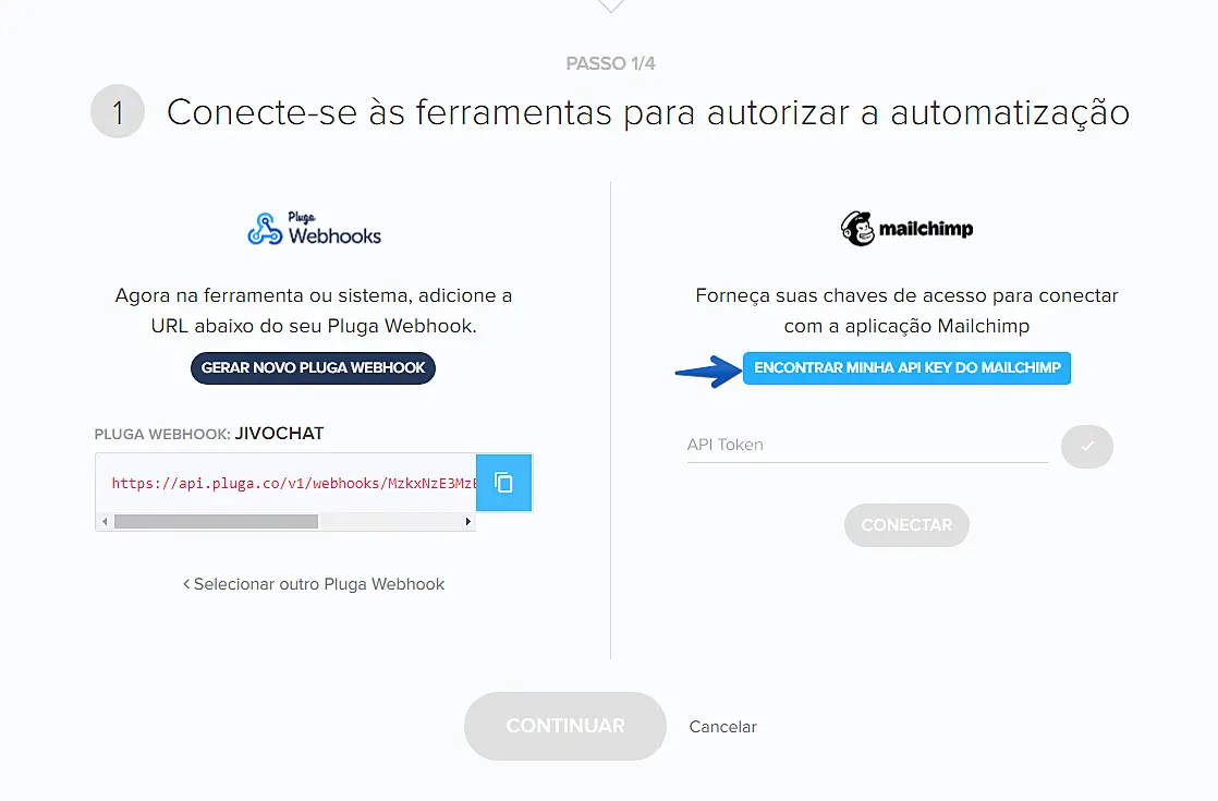 Volte para a sua automatização no Pluga e insira seu API Token do MailChimp. Caso não o tenha em mãos, basta clicar em "Encontrar minha API Key do MailChimp" e seguir o passo a passo.