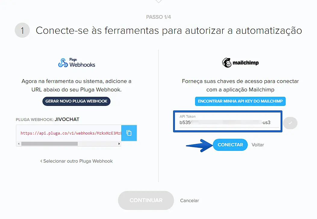 Após inserir seu API Token, clique em "Conectar".