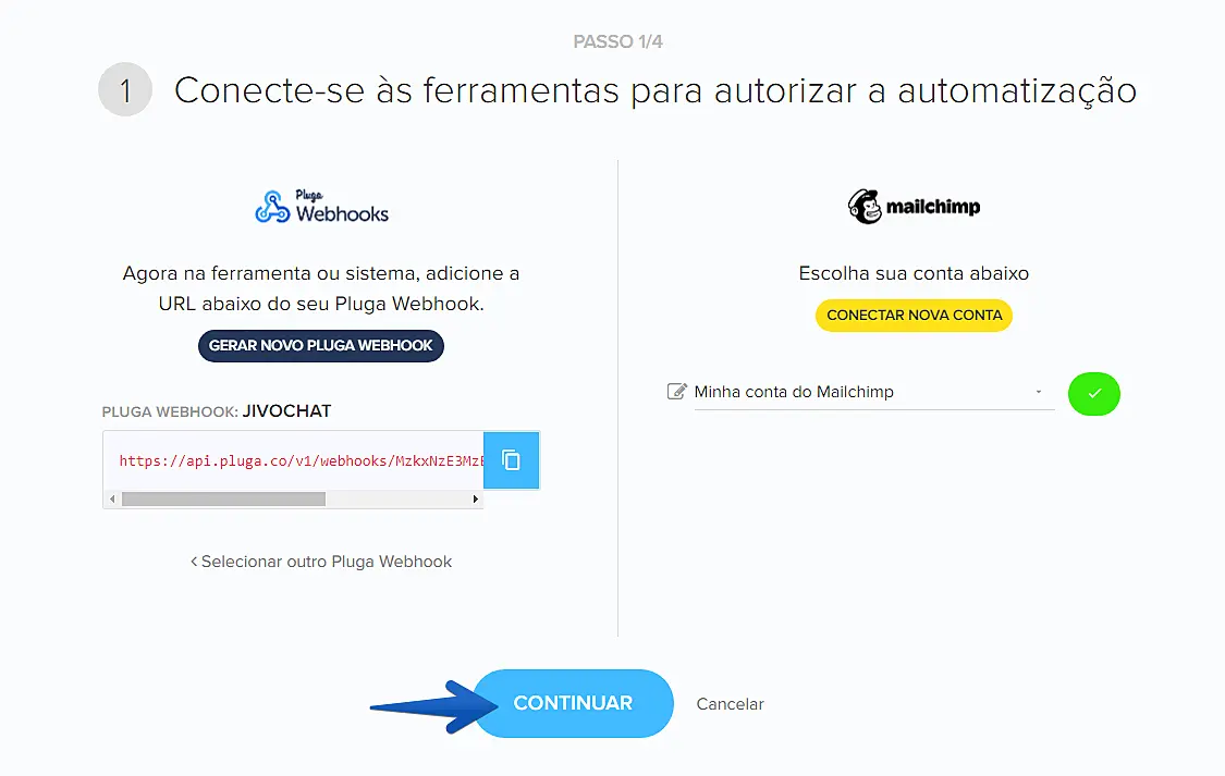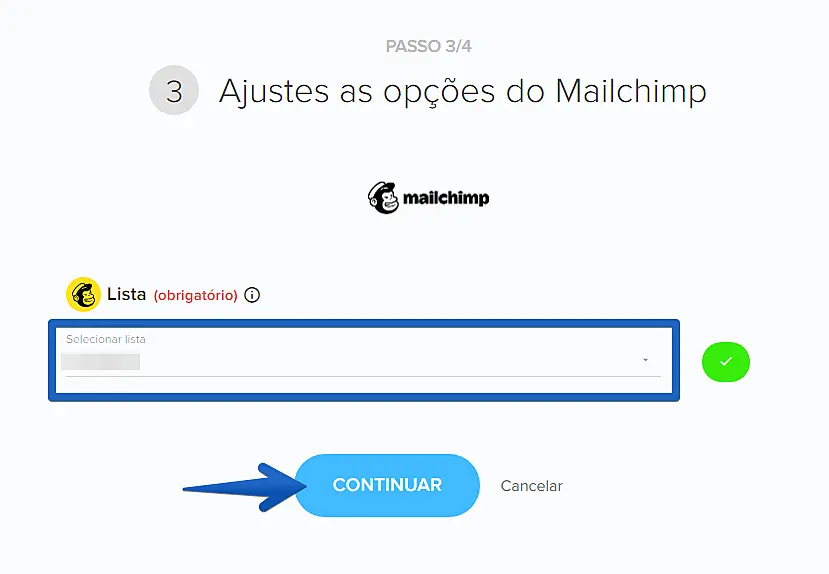Após conectar sua chave API, sua conta do MailChimp já aparecerá na lista. Basta clicar agora em "Continuar".
