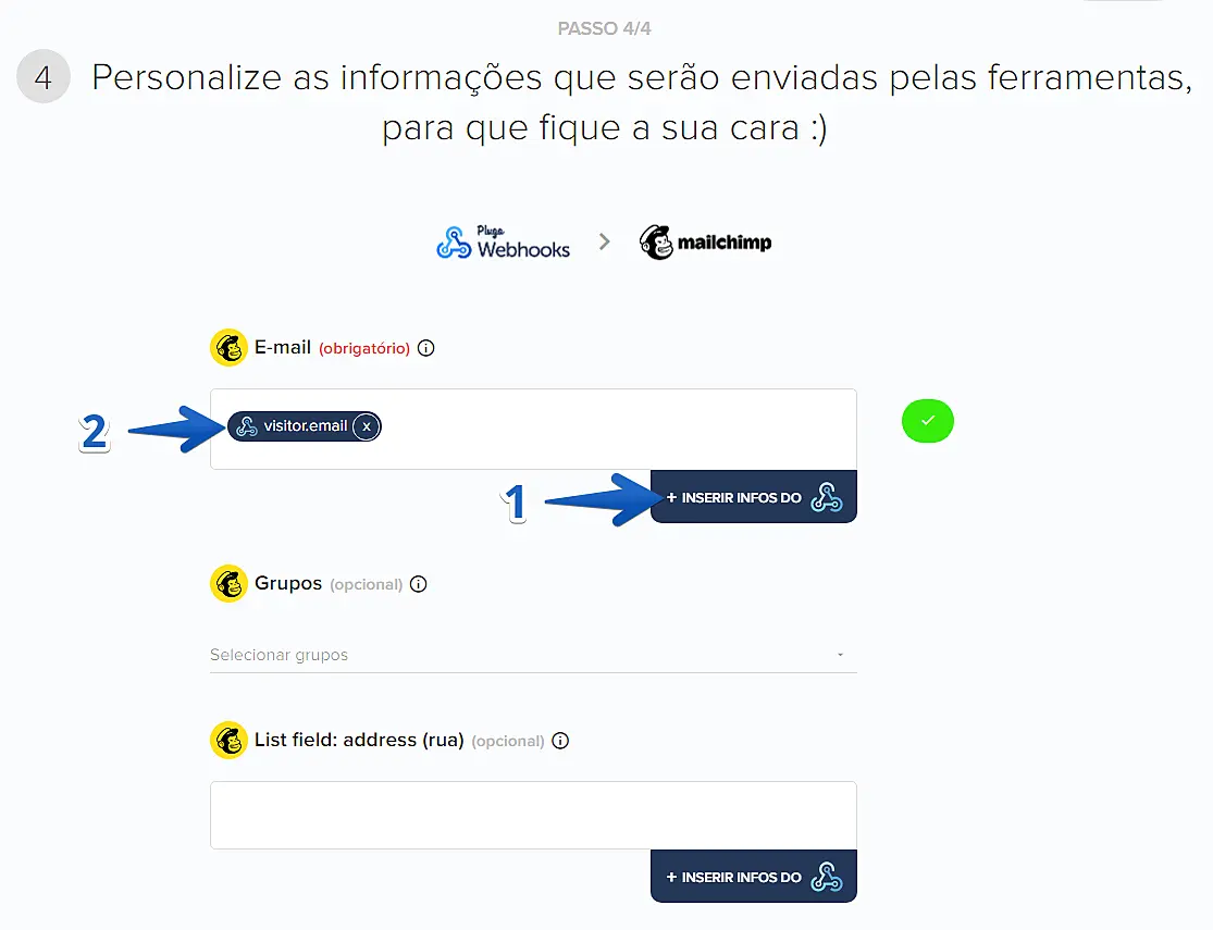 No passo seguinte, mapeie os campos e personalize as informações que serão enviadas pelo JivoChat para a sua conta do MailChimp. Note que há um único campo obrigatório aqui, o e-mail do visitante. Para configurá-lo, clique em "+ inserir infos do" (1) e selecione a opção "visitor.email" (2).