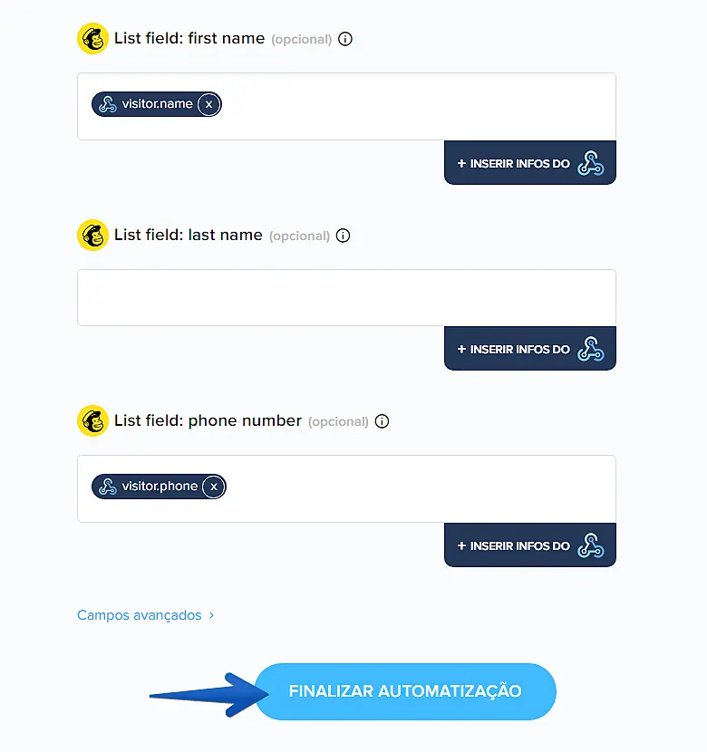 Após preencher opcionalmente os outros campos com os dados que desejar e finalizar a configuração, clique em "Finalizar Automatização".