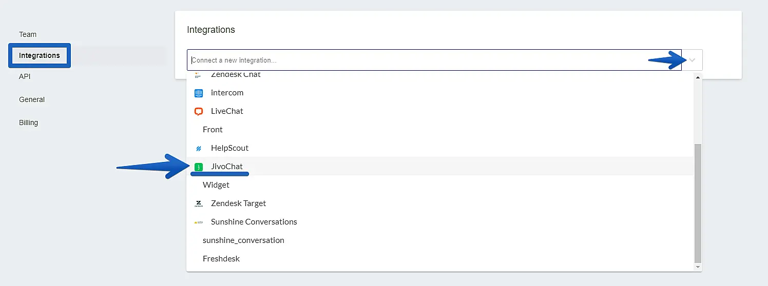 Depois, acesse Integrations -> Clique no campo Connect a new integration -> Encontre o JivoChat na lista que aparecerá em sua tela e clique nele.