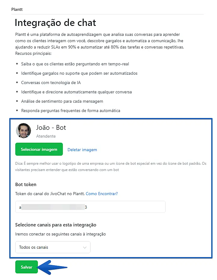 Para conectar a integração, você precisará inserir o token do seu bot da Plantt em seu aplicativo JivoChat.