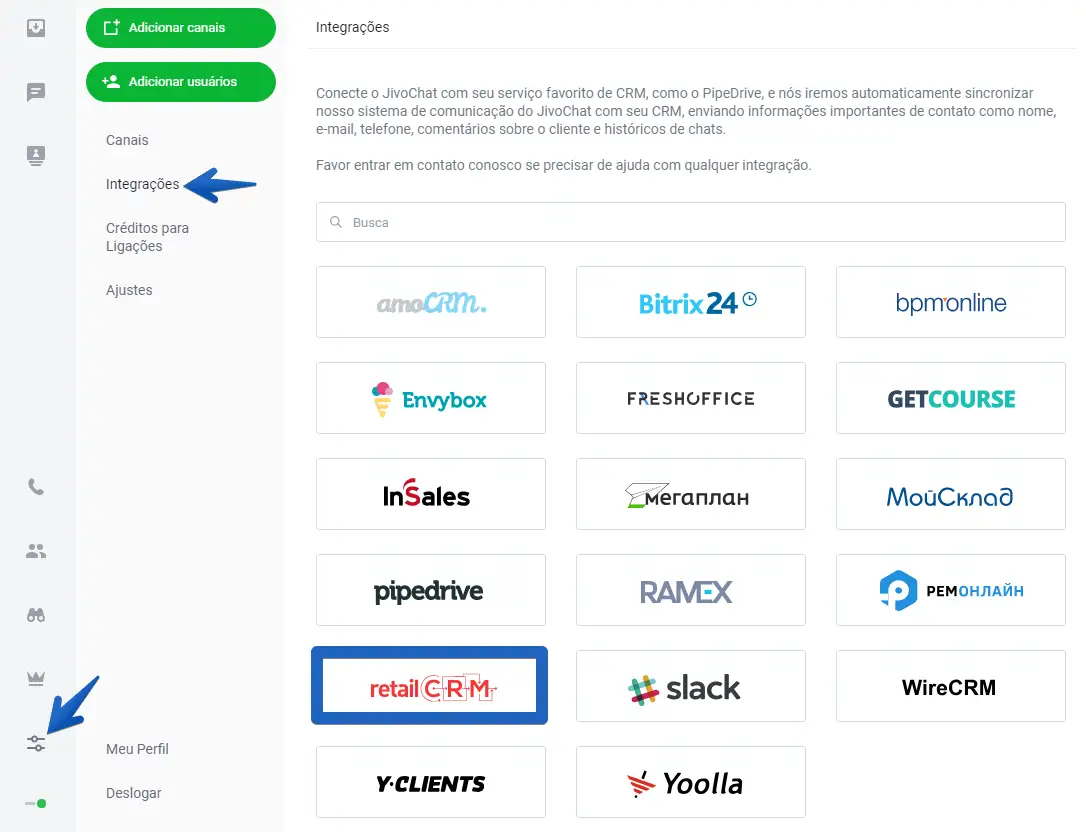 Para integrar o RetailCRM ao JivoChat, abra o aplicativo web do JivoChat ou o aplicativo para Desktop, acesse as Configurações -> Integrações -> e clique em RetailCRM.
