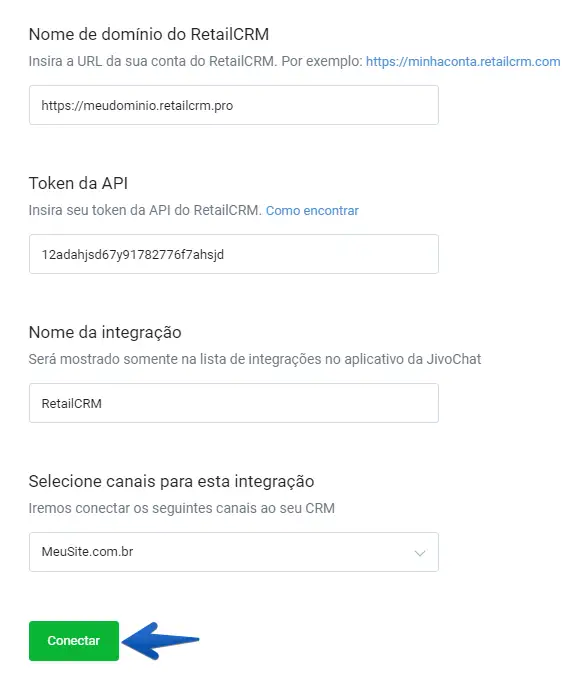 1.Nome de domínio do RetailCRM: Insira a URL do seu sistema de CRM. Você pode copiar a URL diretamente da barra de endereços do seu navegador.
