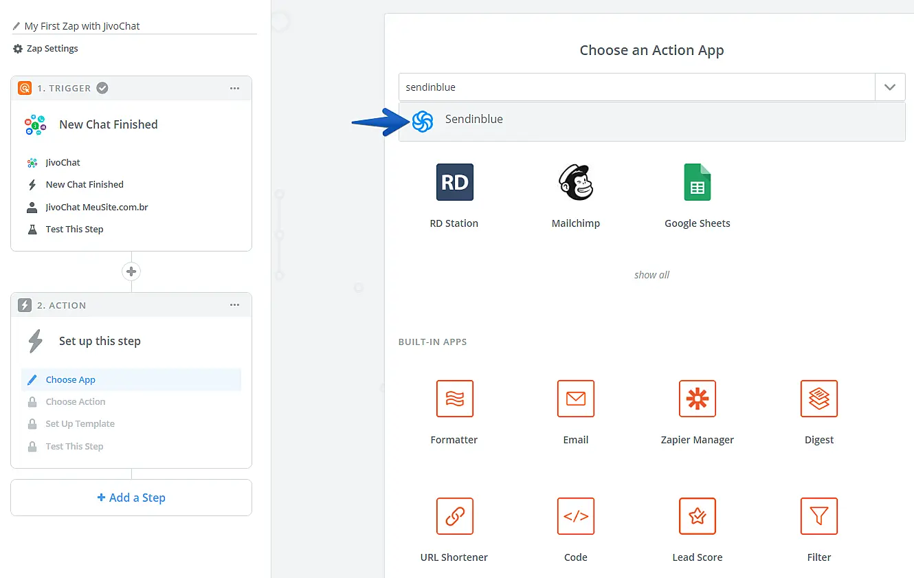 Pesquise pelo aplicativo SendinBlue e selecione-o na lista.