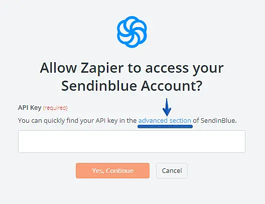 Para conectar sua conta, você precisará inserir sua chave API. Caso não a tenha em mãos, clique em "advanced section" para ser encaminhado ao painel da SendinBlue no menu onde encontrará sua Chave API.