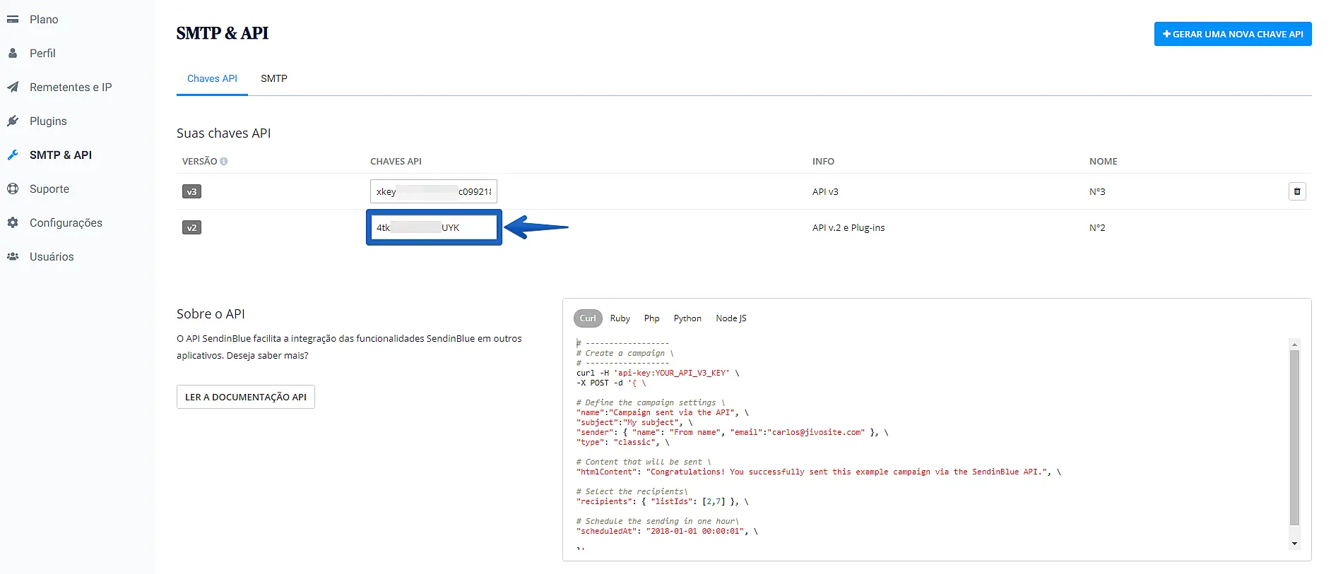 Copie a chave de versão "v2" encontrada no seu painel da SendinBlue.