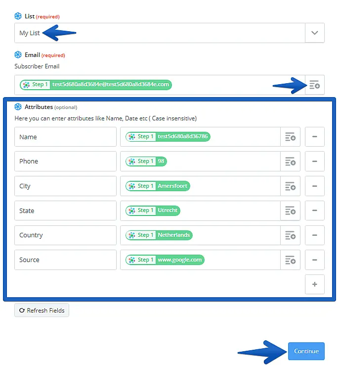 Configure o template da integração da forma que desejar, selecionando ao menos uma Lista (List) e no campo Email, clique para escolher um campo do JivoChat (apontado na imagem abaixo à direita do campo de Email) e selecione o campo "Visitor's email" (E-mail do visitante). Caso deseje, pode escolher outros campos do JivoChat para inserir nos campos opcionais de Atributos (Attributes) que encontrará mais abaixo. Note que os Atributos devem ser configurados previamente dentro da própria SendinBlue para que funcionem corretamente; se precisar de apoio, entre em contato com o suporte da SendinBlue.